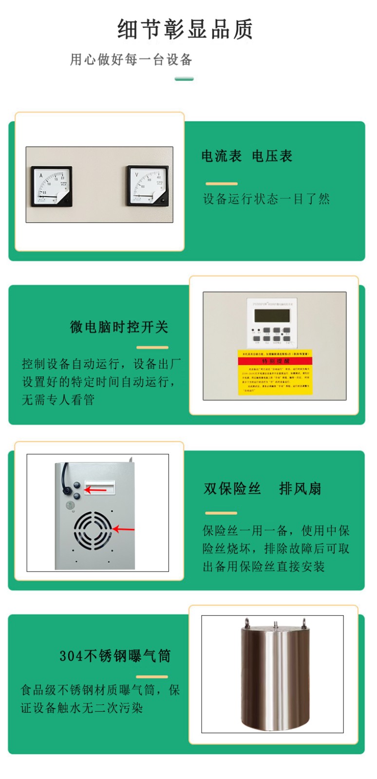 A、本系列產(chǎn)品無人值守,微電腦全半自動運行,半自動開機消毒滅菌,半自動停機.也可人工運行開關(guān)機。機器底部配有萬向輪,移動輕松自若,位置確認后,放下剎車器即可定位。安全靠得住?! ?br/>B、本系列產(chǎn)品可依據(jù)需求安放在操作室內(nèi)任何位置,利用自帶風機將萌生的臭氧氣平均送至整個水箱內(nèi),達到消毒滅菌效果。運用便捷,滅菌效果顯著。